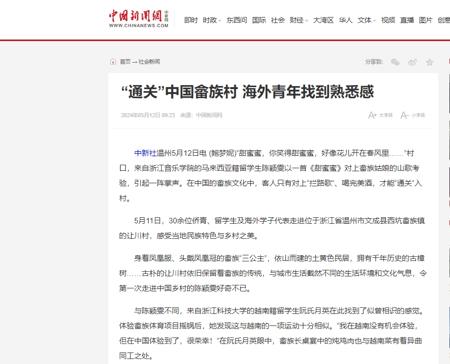 5月11日,30余位侨青、留学生及海外学子代表走进位于浙江省温州市文成县西坑畲族镇的让川村,感受当地民族特色与乡村之美。我校越南籍留学生阮氏月参加活动,并接受相关媒体采访。