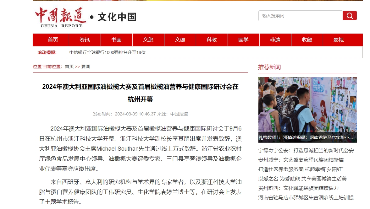 9月6日,2024年澳大利亚国际油橄榄大赛及首届橄榄油营养与健康国际研讨会在我校开幕。中国报道网、浙江报道网等媒体对活动进行了报道。