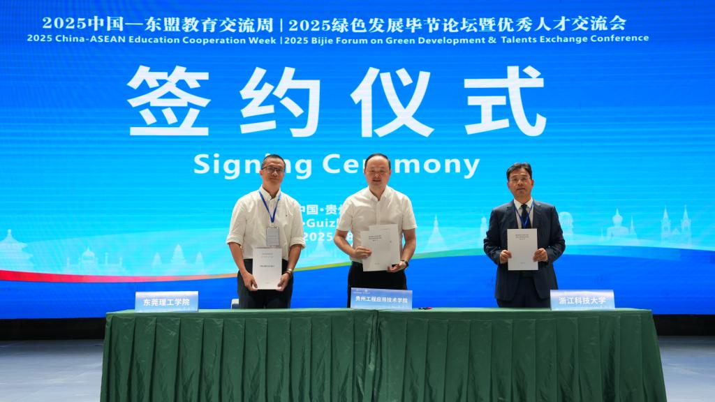 近日,中国-东盟教育交流周2025绿色发展毕节论坛暨优秀人才交流会在贵州工程应用技术学院开幕。本次以“绿色引领发展,人才共创未来”为主题,围绕资源与环境、材料与化工两个方向开展,目的是搭建地方与国内外学术机构、绿色低碳产业合作交流平台,推动绿色发展产业链、创新链、资金链、人才链的有机融合,赋能毕节新质生产力发展。贵州省教育厅副厅长白震,毕节市人民政府副市长杨静,贵州工程应用技术学院党委书记熊星出席开幕式并致辞。我校党委副书记单胜道出席,并代表学校与贵州工程应用技术学院党委副书记、校长张嗣杰签订校际合作协议。