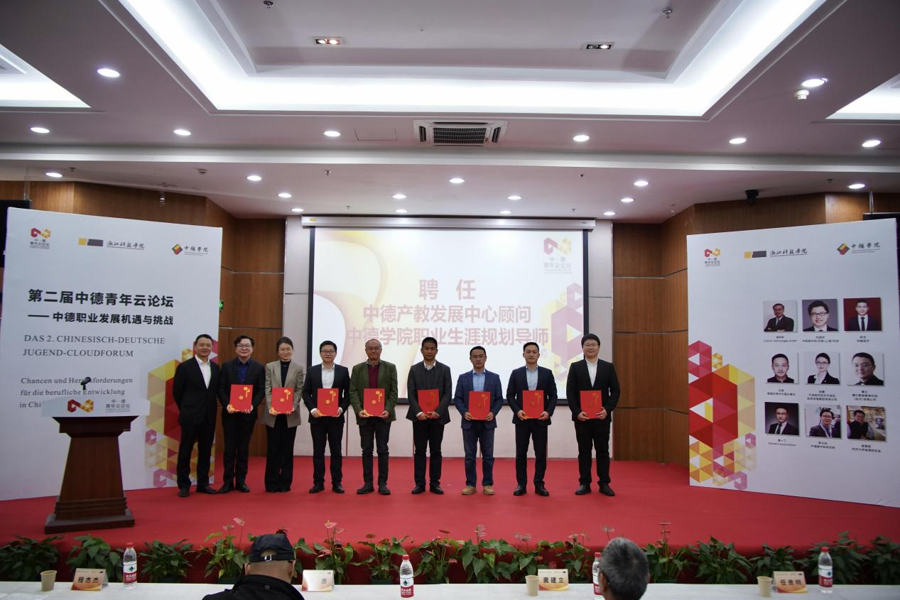 活动上举行中德产教发展中心揭牌仪式。该中心由中德学院与尚坤集团德中数智教育科技(杭州)有限公司发起共建,双方将在人才培养、技术创新、产业合作、政策支持、资源整合和创新创业支持等方面合作,共同推动中德产业集群建设,促进两国在多领域的深度合作,实现互利共赢的发展目标。来自企业、学校的专家受聘为中心顾问和生涯导师。