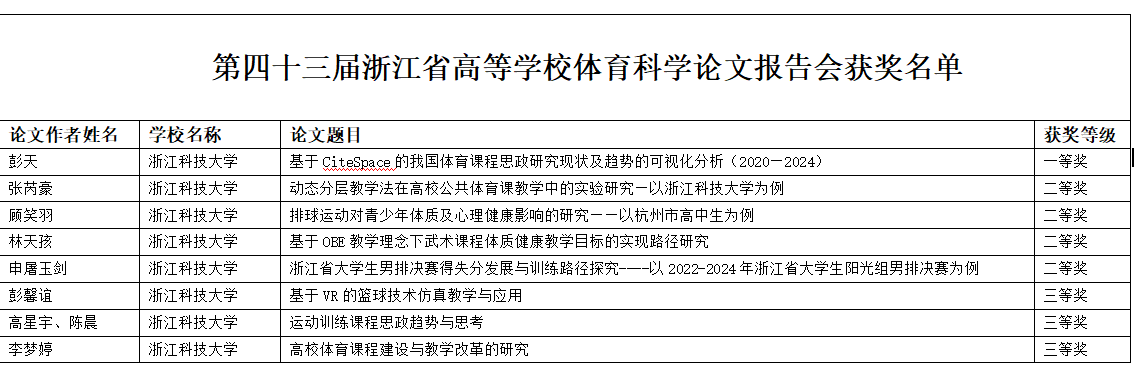 本次大会由浙江省学校体育协会和浙江省高等教育学会体育教育分会联合主办,共收到来自全省42所高校的203篇论文。此次我校教师取得优异成绩展现了我校在体育科研领域的进步,为深化“体教融合”战略、推动高校体育高质量发展提供了扎实的理论支撑与实践范本。(体育部