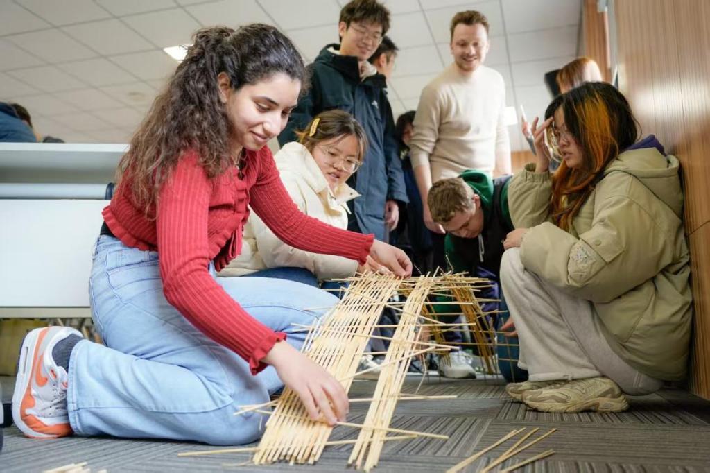 在工作坊期间,中德学生助教混编成小组,在2小时内仅用木条与麻绳完成承重结构。本次活动受到了德方和中方老师学生一致好评,希望通过文化和技术交流,共同建设好土木工程专业。(中德工程师学院 黄竹也)